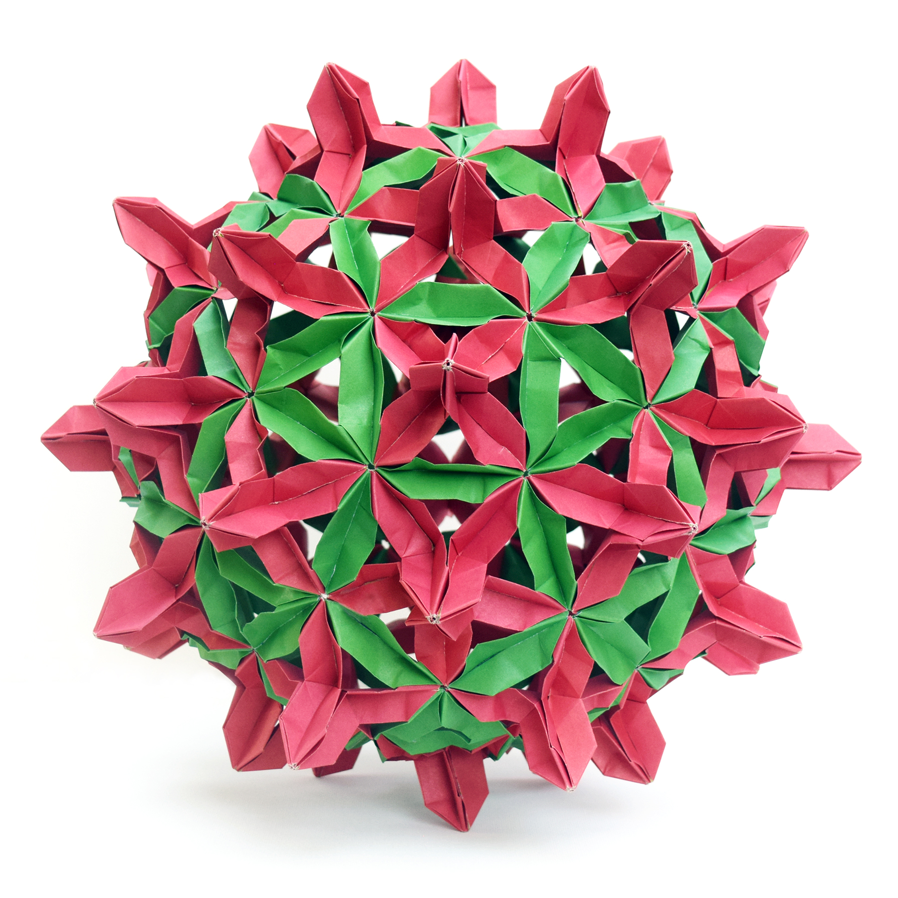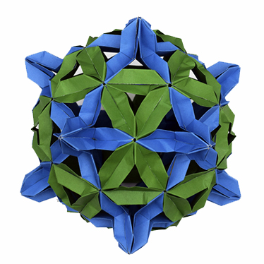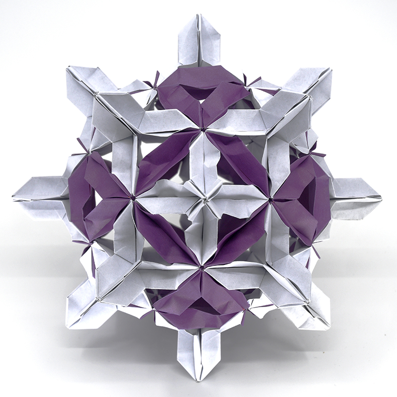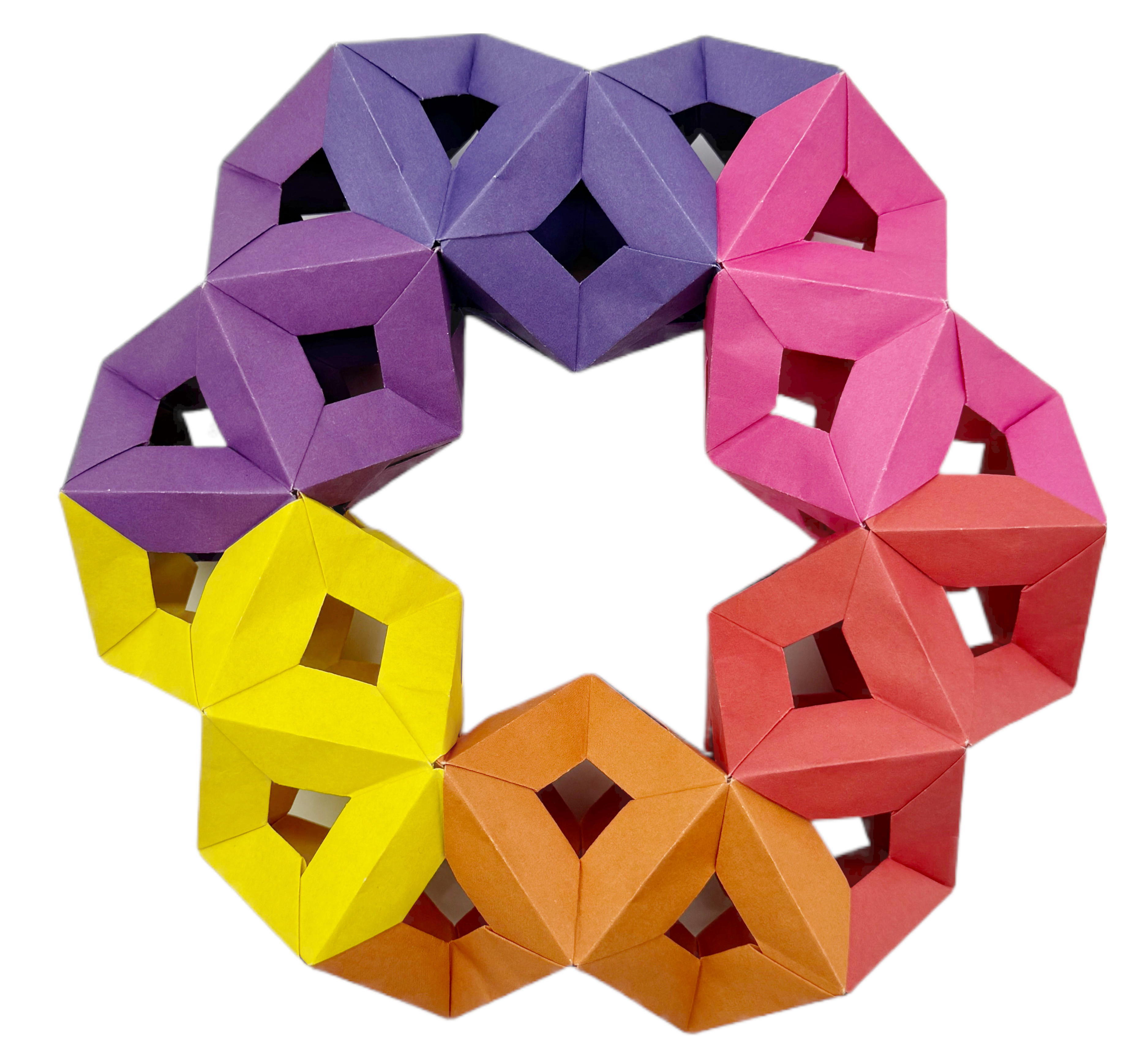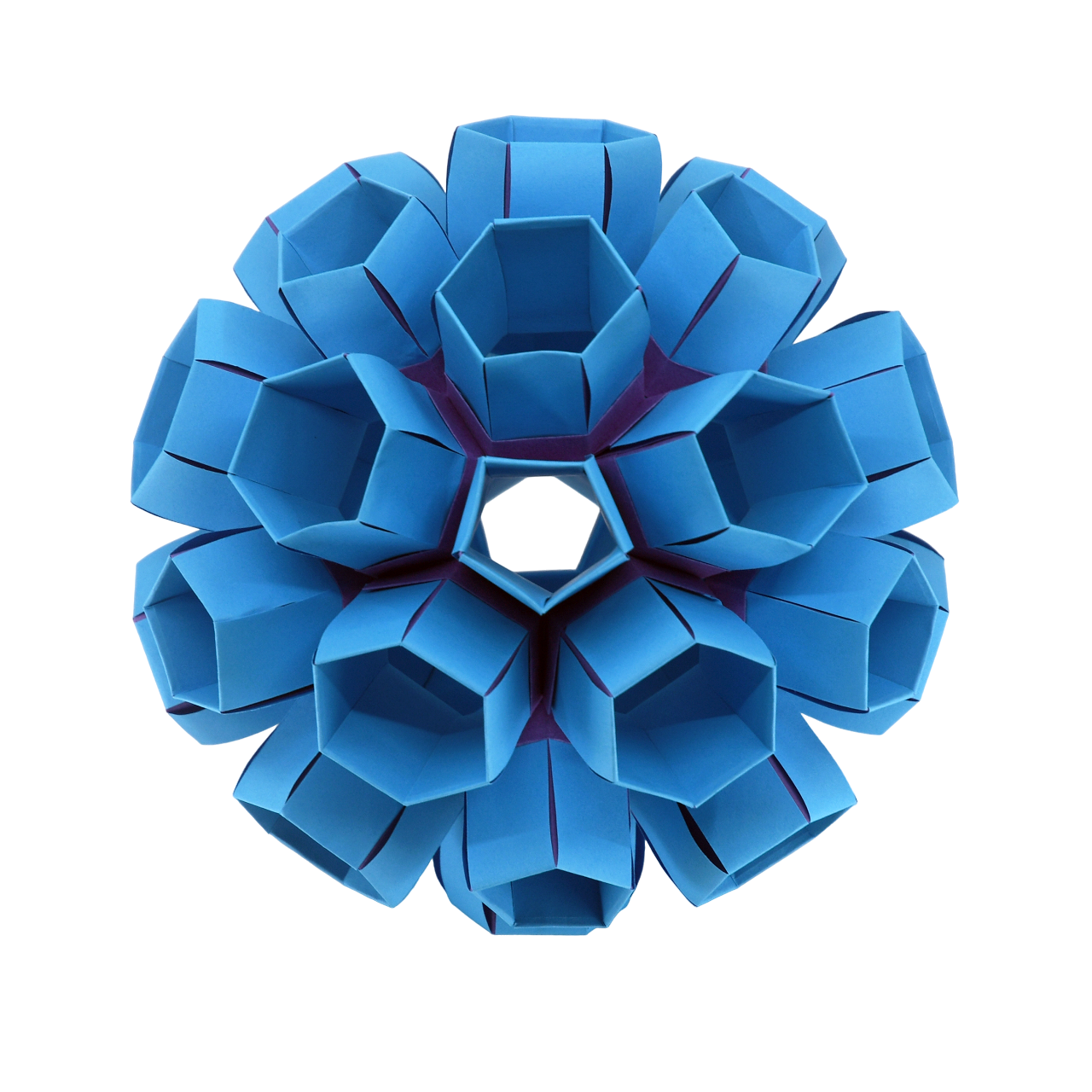 These polyhedral structure explores different polygonal shapes, combining a dodecahedron and its elevation (left), and an icosahedron and its elevation (right). More information on the paper including folding diagrams and supplimentary materials are published in the Bridges Halifax 2023 proceedings.