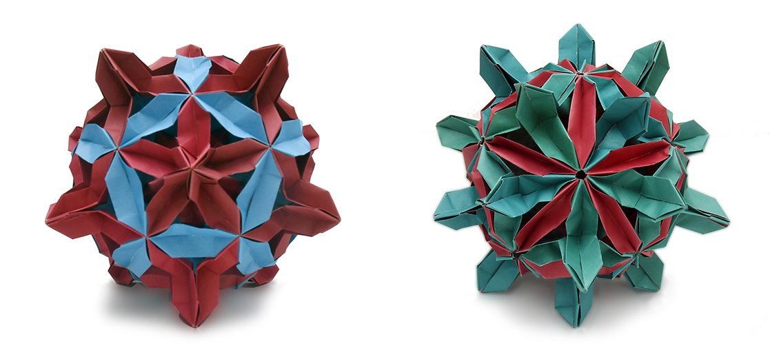 These polyhedral structure explores different polygonal shapes, combining a dodecahedron and its elevation (left), and an icosahedron and its elevation (right). More information on the paper including folding diagrams and supplimentary materials are published in the Bridges Halifax 2023 proceedings.